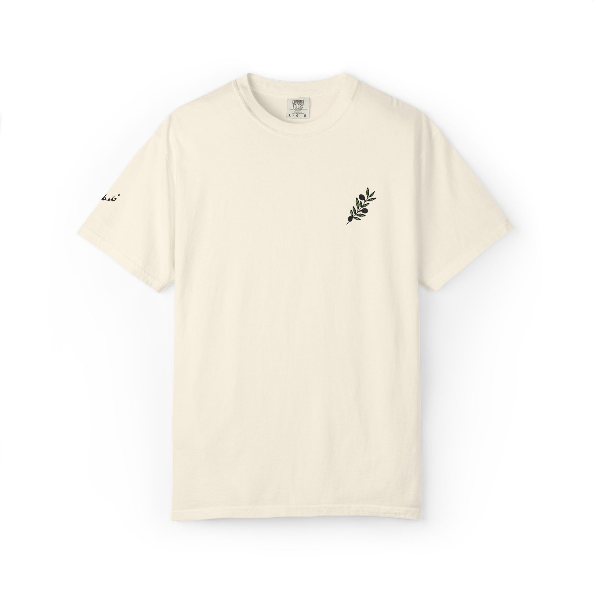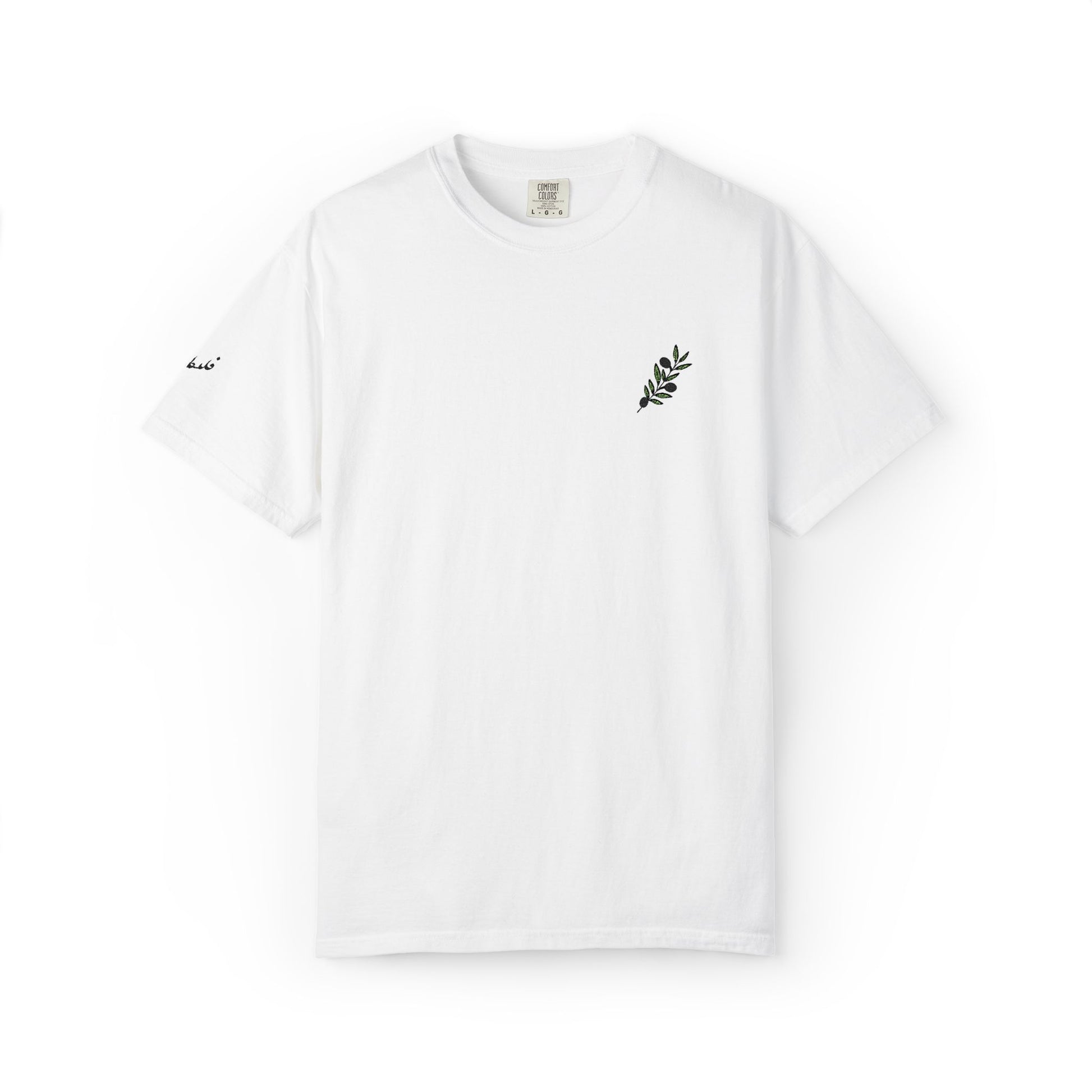 This garment-dyed tee features a minimalist olive branch design on the chest, honoring the symbol that represents both peace and Palestinian rootedness to the land. Made from 100% ring-spun US cotton with a soft, lived-in feel from day one, it's built for those who understand that some symbols grow deeper with time.