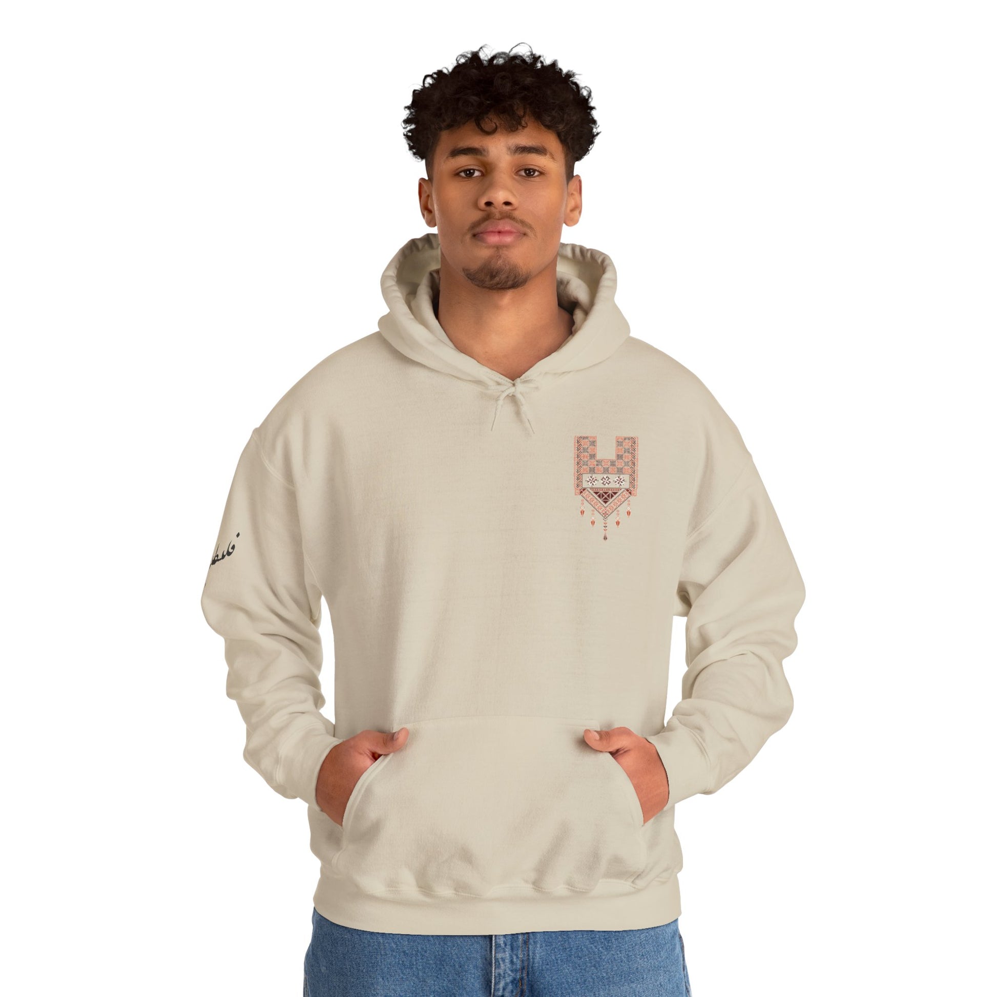 Made from a comfortable cotton-poly blend with a spacious kangaroo pocket and adjustable drawstring hood, it's built for those who appreciate both heritage and comfort. The embroidered tatreez patterns transform this hoodie from everyday wear into wearable art.
